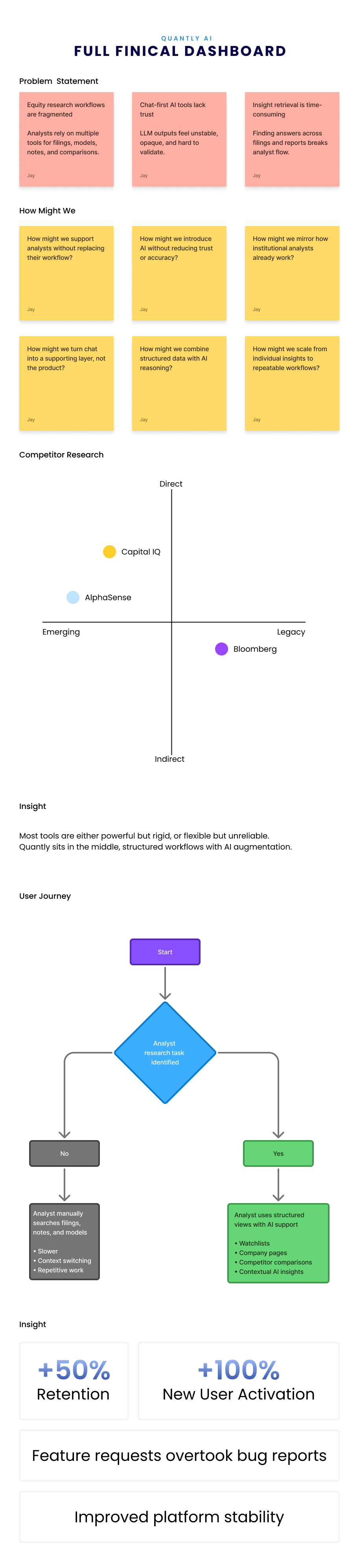Quantly evolved from a fragile chat prototype into a credible equity research platform. The product no longer asked analysts to guess what to do or tolerate failure. Instead, it met them where they already worked and used AI to accelerate understanding without increasing cognitive load.